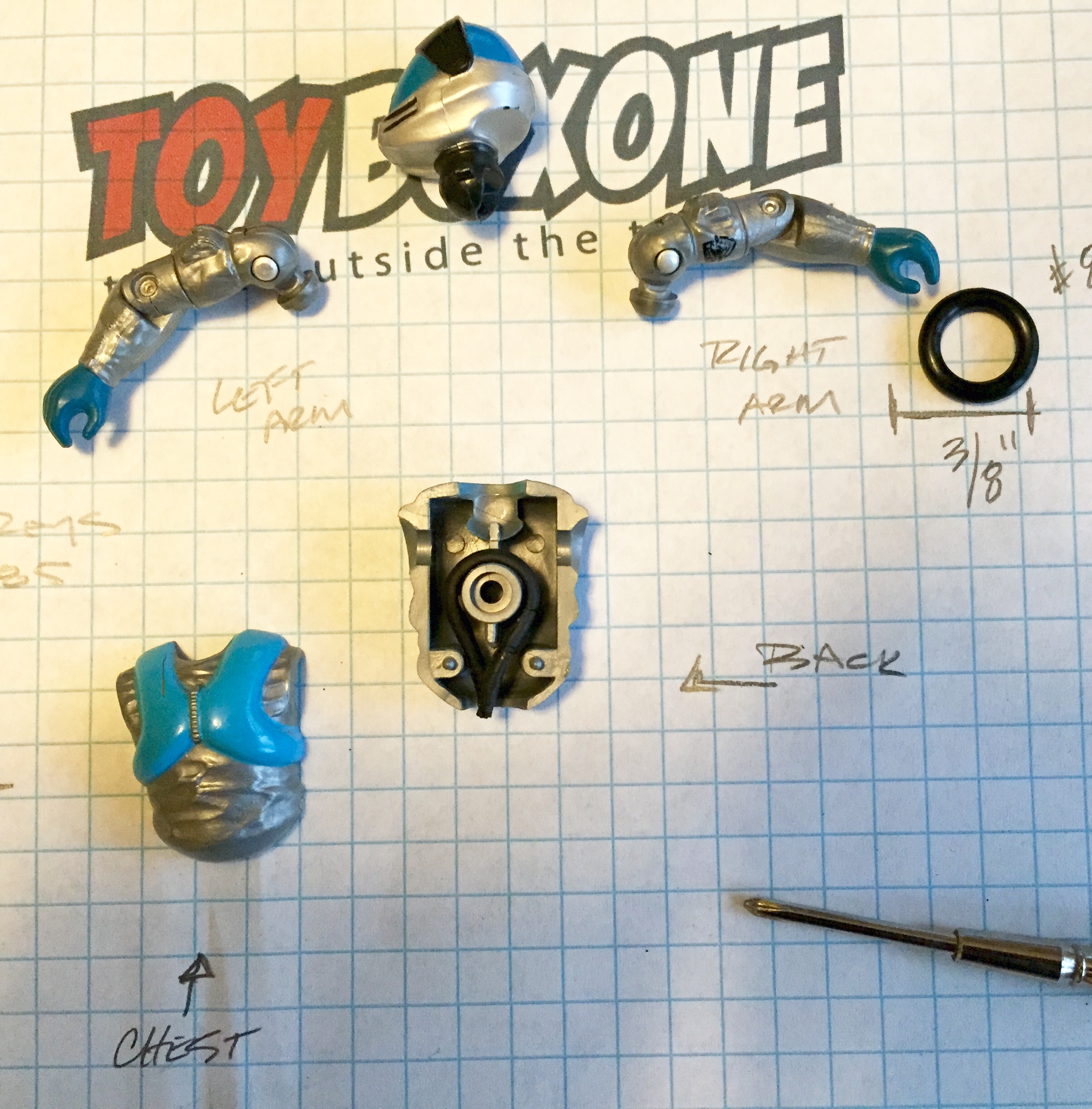 First, loop the new o-ring through the metal piece in the legs and cod piece. Then string it around the back torso and attach arms, head, and chest.