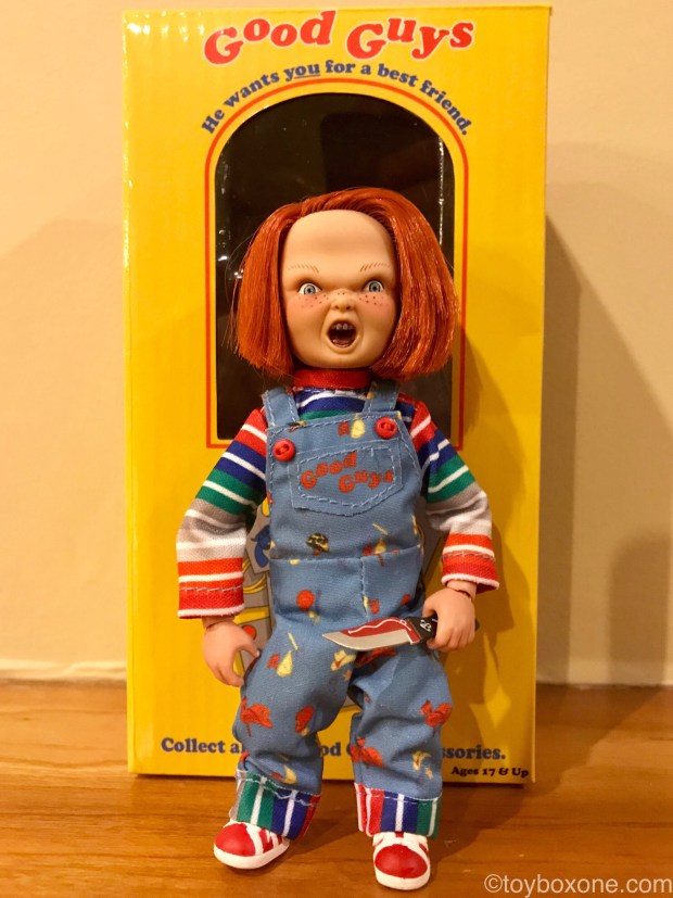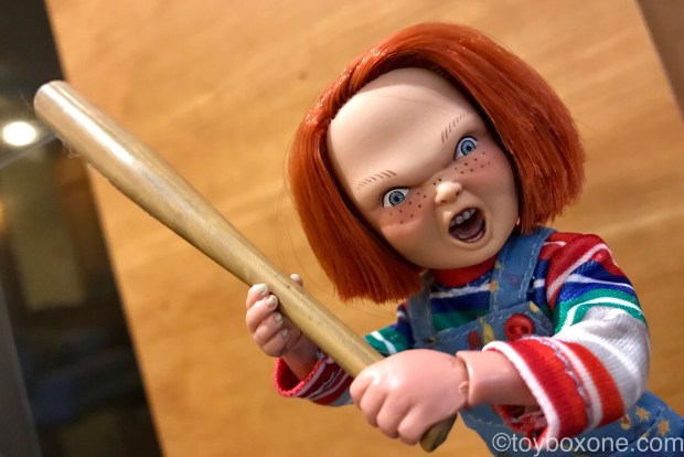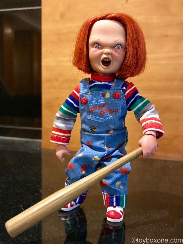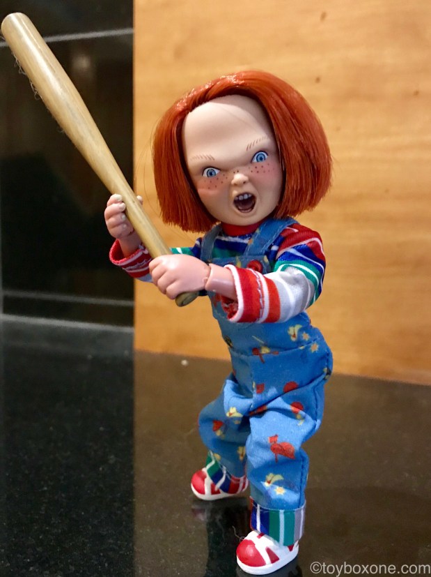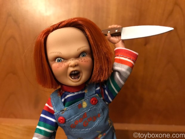 The tailors also did a good job with this one. His Good Guy overalls are really detailed and fit well, even on such a small scale.He comes with all his tools from the original movie with chef’s knife, baseball bat, voodoo knife, ans his Good Guys hammer. There are plenty of tools to help you relive the classic scenes. The only thing that would make this figure better is an alternate head. With the real hair stitched and extra cost I get why they went with one. I’m sure they were saving those for their Ultimate Chucky shipping next month.