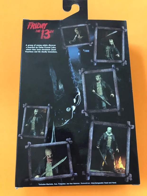 On the back is a collage of Jason doing different killing things with his various killing tools.