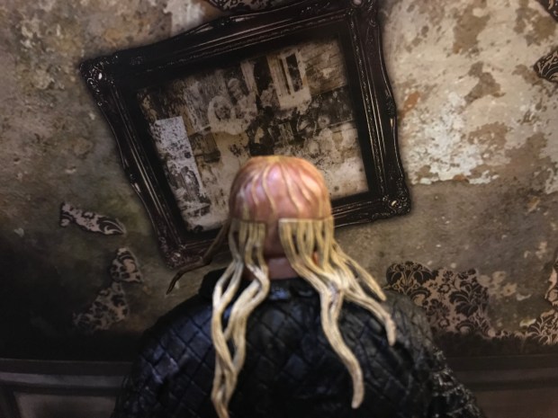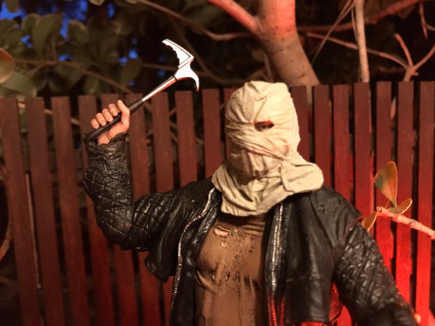Out of the box you get machete, axe, fire poker, hammer and screwdriver. It also comes with two interchangeable heads (one has a removable mask). As far as articulation goes, the description says it comes on “an extra-articulated Ultimate body”. While he is a little more posable then previous figures, he literally broke in half while trying to execute some simple poses. He seems to snap back together pretty easy but pretty sure he won’t be winning any Hula Hoop competitions. I am also not sure if this is happening to others or just isolated to my figure. Since he goes back together and still holds poses this is a non-issue for me really. I have one other gripe and it totally seems nit picky. When you remove his mask there is an obvious seam line from where his mullet attaches to his head. I understand you can only get so much detail and remain at a certain price point. Even with that noticeable flaw the head sculpt still looks good. Also, it is only truly noticeable when his mask is off, and how often does that happen?