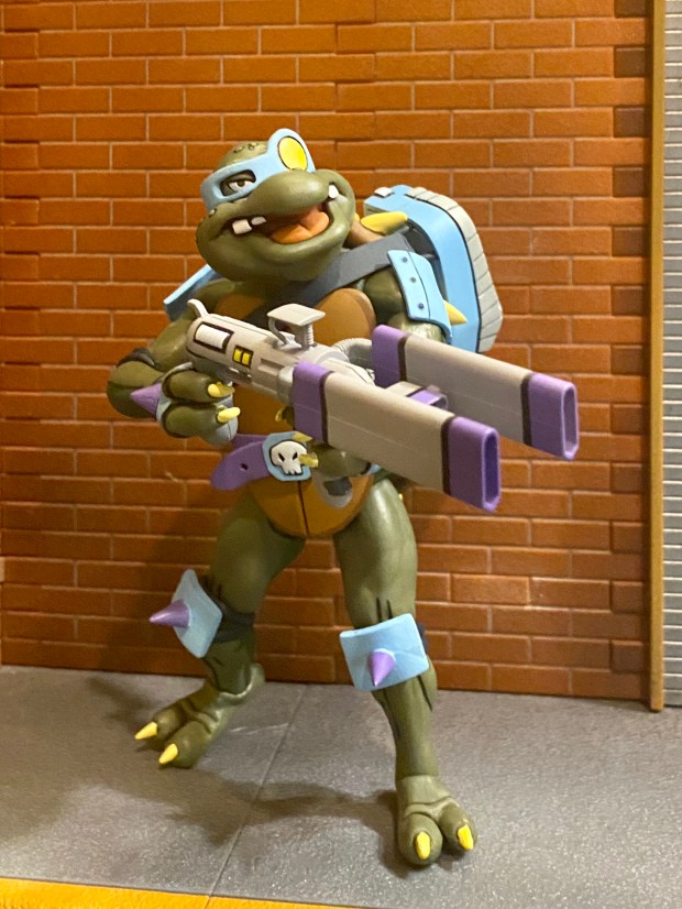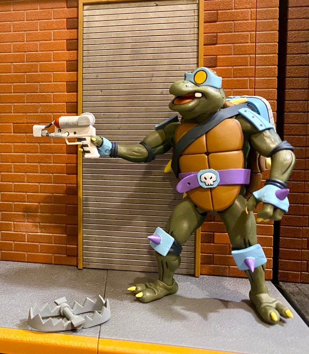 Slash comes with a half-eaten pizza, Shredders Shaolin swords, and of course his “binky”. He also gets a pair of high tech weapons from his return from space to attempt to complete his trans frequency flux oscillator. Slash himself is the same size as the other 4 turtles as far as scale. The joints on mine were super stiff so be sure to use care when posing him in different positions. Also, be careful handling around his backpack as the straps are barely held on to start with and can see that as an easy break point.